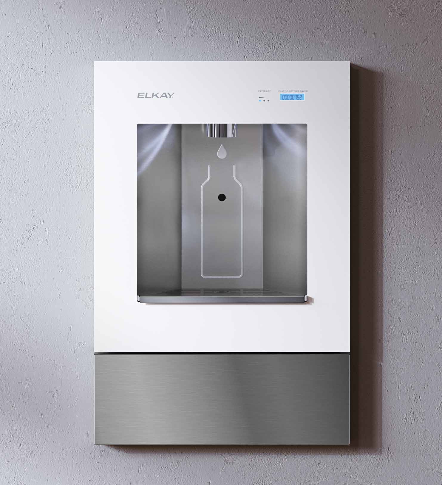 Contemporary design in-wall water dispenser with sensor activated hands-free bottle filling. Featuring interactive lighting and Green Ticker™ counting the number of plastic bottles saved with each refill. Ideal for contemporary office, homes, conference rooms, lobbies and commercial locations.